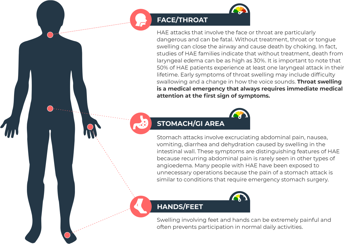 People with HAE experience recurrent episodes of swelling in the hands, feet, genitals, stomach, face, and/or throat that can last from two to five days. The frequency and severity of attacks may vary dramatically in people affected by HAE, even those in the same family. About 25% of people with HAE experience a flat, non-itching red rash that often occurs before or during an HAE attack.
